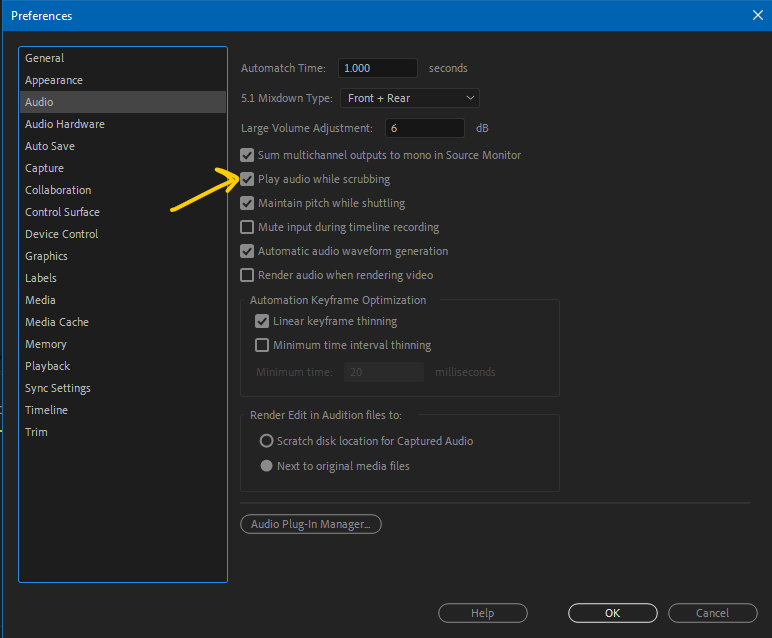 Check this box so that as you scrub (dragging the play head across media) the timeline or source monitor and you’ll hear audio playback. This is very helpful when testing how edits between clips work, finding beats in music, and digging through dialogue.