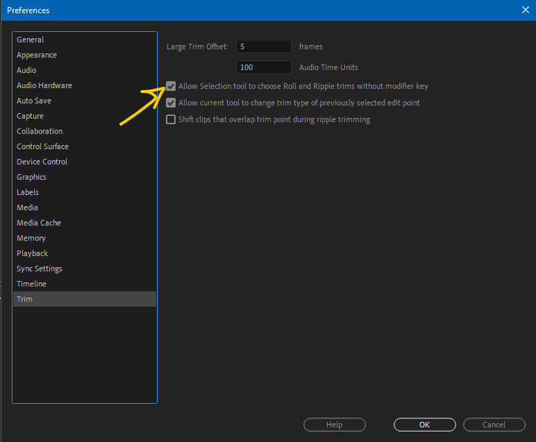 Trim > Allow Selection Tool to Choose Roll and Ripple Trims Without Modifier Key – That’s a mouthful…and in my opinion the most important preference to change. This will allow our mouse to act as three separate tools at once when editing clips on the timeline. When checked, this enables the mouse to ripple trim left or right and roll an edit left or right simple by moving the mouse’s location around an edit point. More on that in part 3.