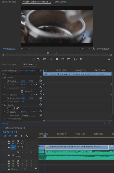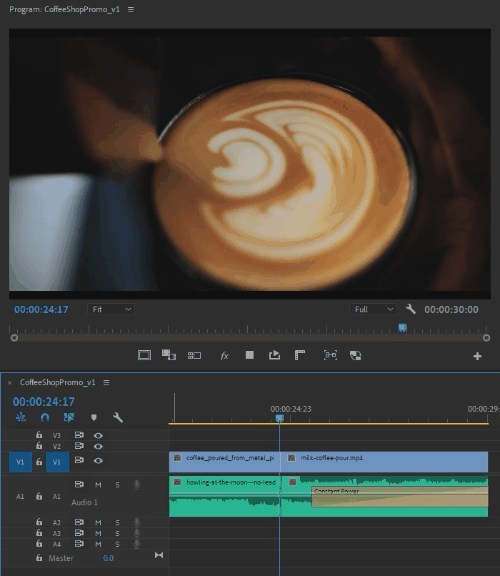 As the edit continues, let the music dictate the pacing of the video. You’ll notice the shots early in the piece are longer because the music underneath is building. Once we hit the dramatic break in the middle of the video, things pick up musically and our shots shorten. The pace picks up. The coffee’s story continues as it brews. Music and footage eventually culminate to our final shot – a slow pour of milk into a latte – letting the viewer relax and enjoy the logo we’ll add later in part 8.