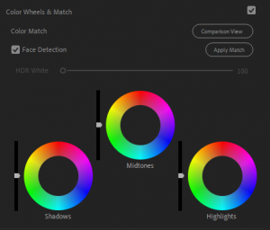 Part of Adobe Sensei technology, Lumetri’s color matching feature is found under the Color Wheels & Match tab. While not always perfect, it can do a good job or at least get you headed in the right color direction. To use, turn on comparison view, point the reference monitor (now left-hand side of program monitor) to a timeline clip you like the color of, and back in the Lumetri panel, click Apply Match. Within a few seconds Lumetri’s color wheels and levels adjust to give you a color-matched shot.