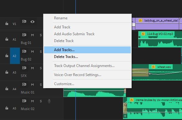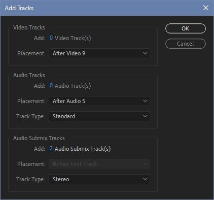 A window pops up that allows you to add multiple video or audio tracks to your sequence at once. In this case, I’m adding 2 submix audio tracks. For my more complex edits, I usually end up with 3 submix tracks – dialogue, sound effects, music – which works out well if I need to make audio splits or stems.