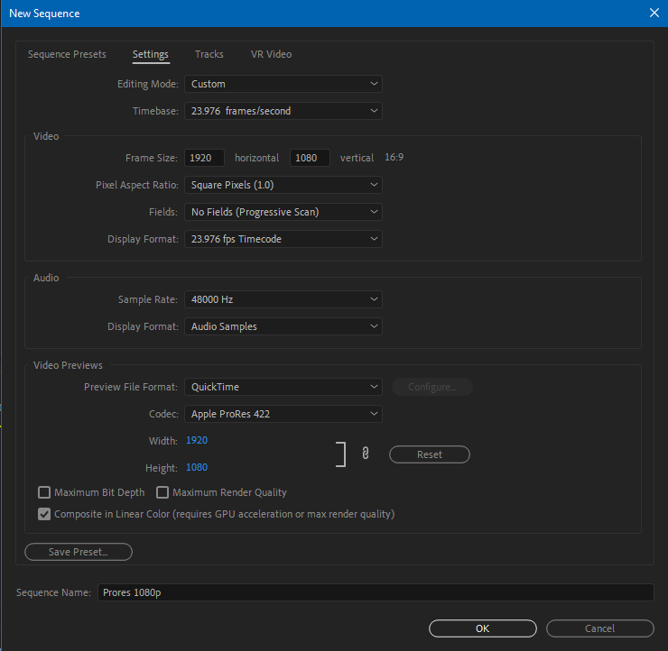 I won’t go into it here, but it’s important that your preview format is a good quality editing codec like Quicktime Apple Prores.  If you want to know more about why that’s important, check out my post on codecs.  I’m also a fan of the look of 23.98 fps.  Confused on the fps thing?  I’ve got you covered.