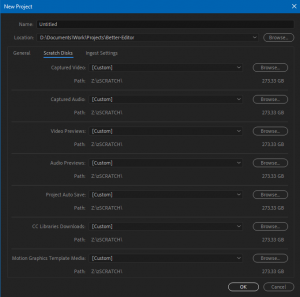 Open a new project and you’re presented with a page full of options that might seem intimidating…fret not.  For us now, the defaults on the general tab are fine to leave alone.  Let’s take a look at those scratch disks.